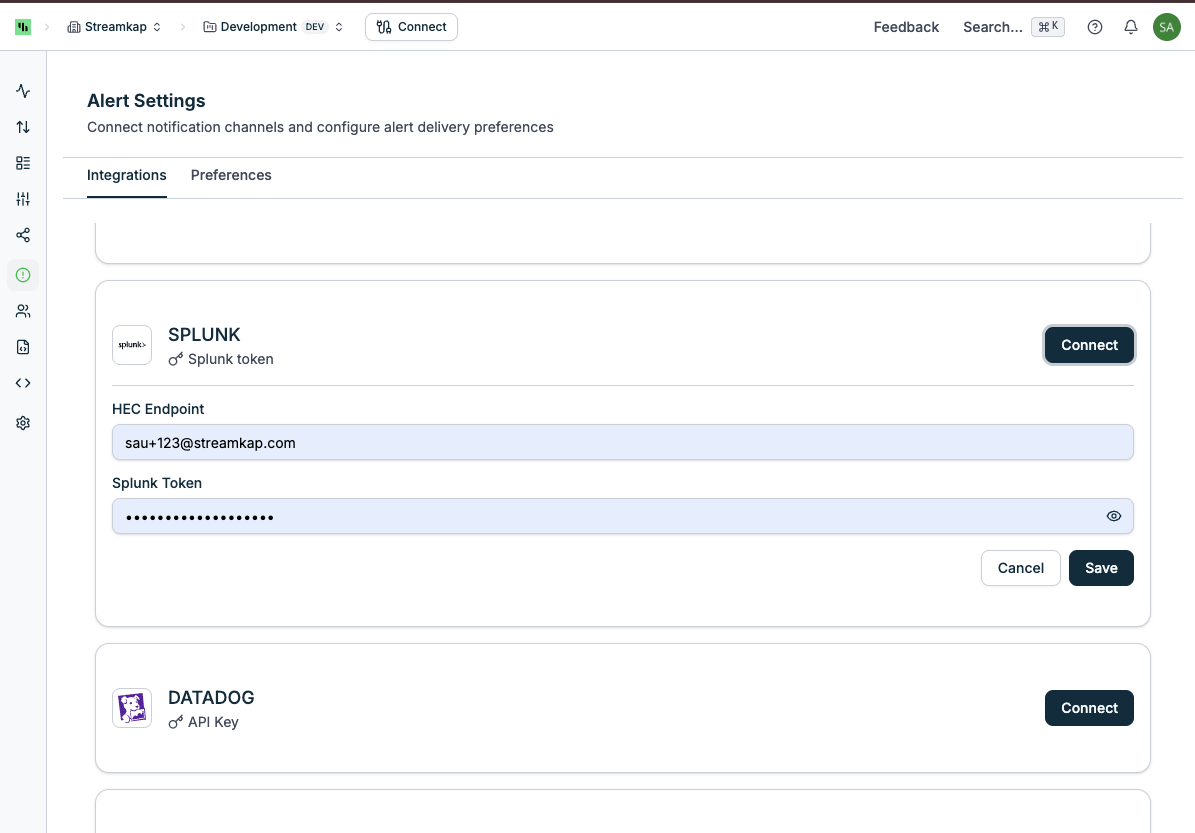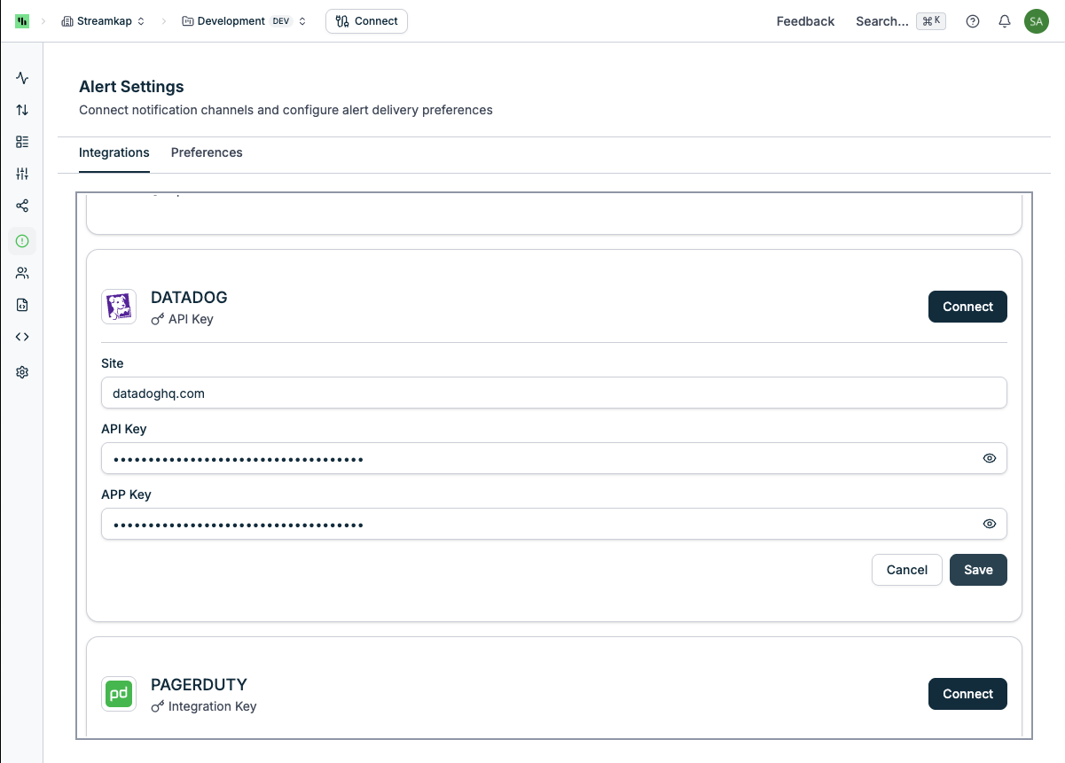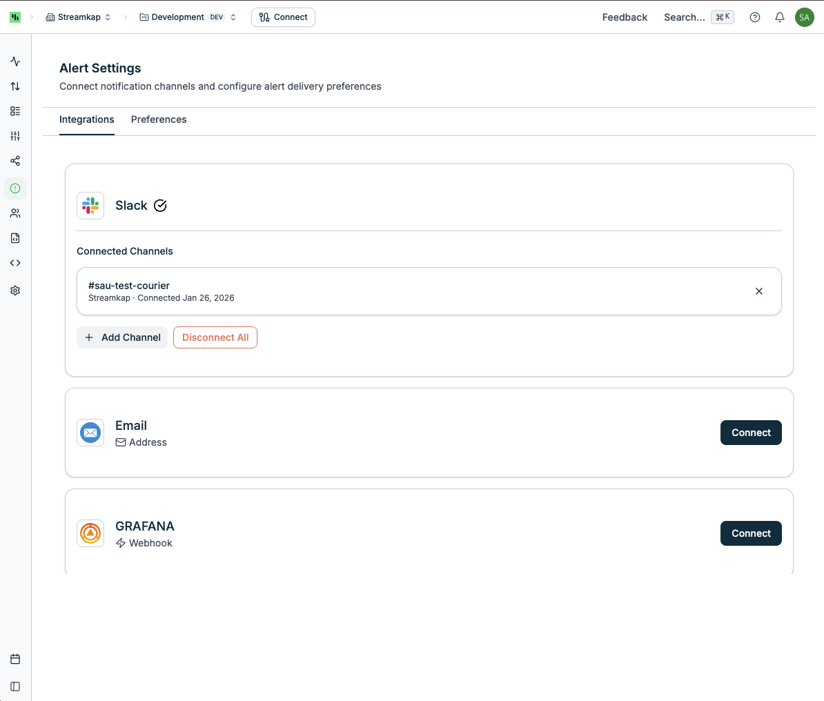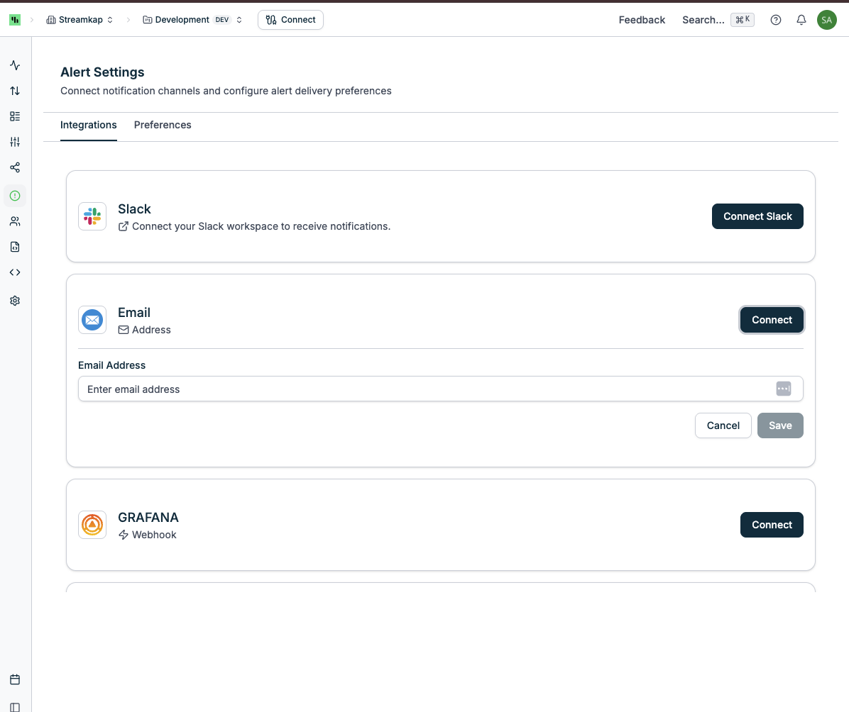 Configure integration channels to receive alerts outside the Streamkap app: