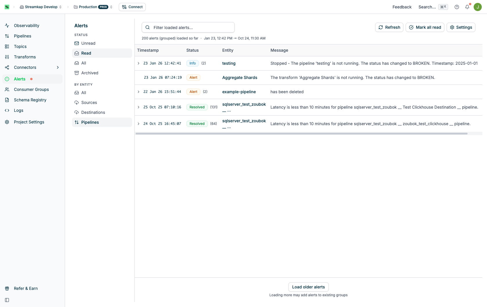All alerts appear in the Alerts page within the Streamkap app. Unread alerts are indicated with green text and a dot indicator.Email Notifications