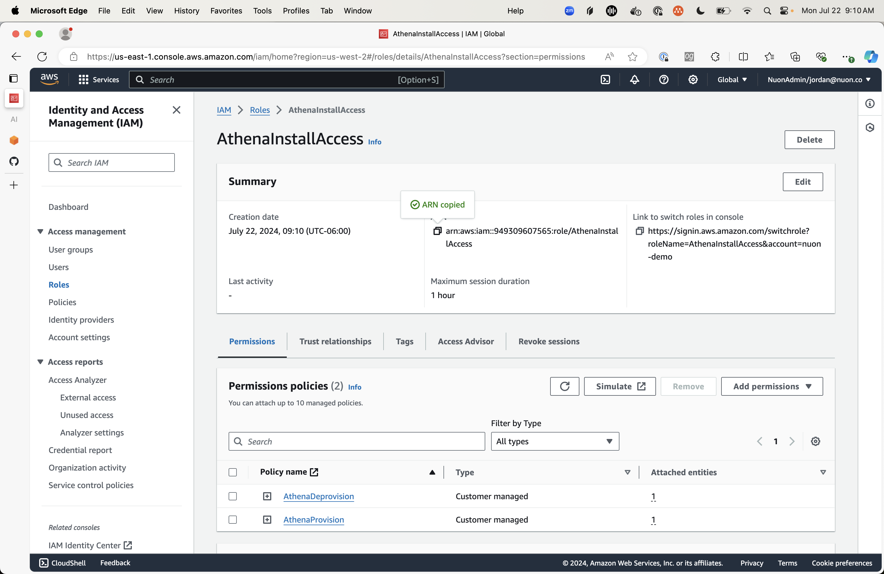 - On the role page, locate the ARN field and make note of the value. It should take the form