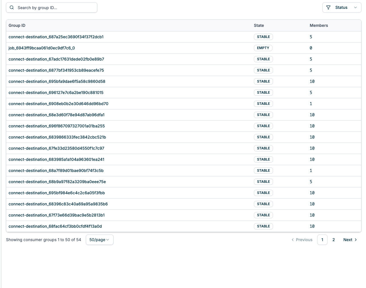 The main table lists all consumer groups with the following columns:- Group ID: The unique identifier for the consumer group