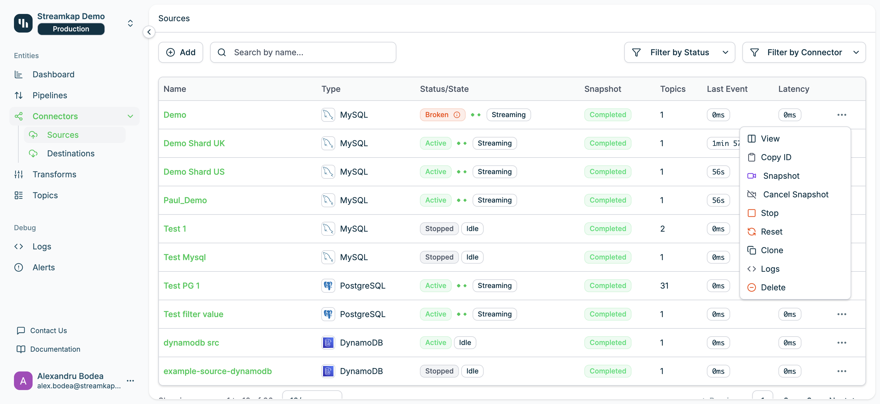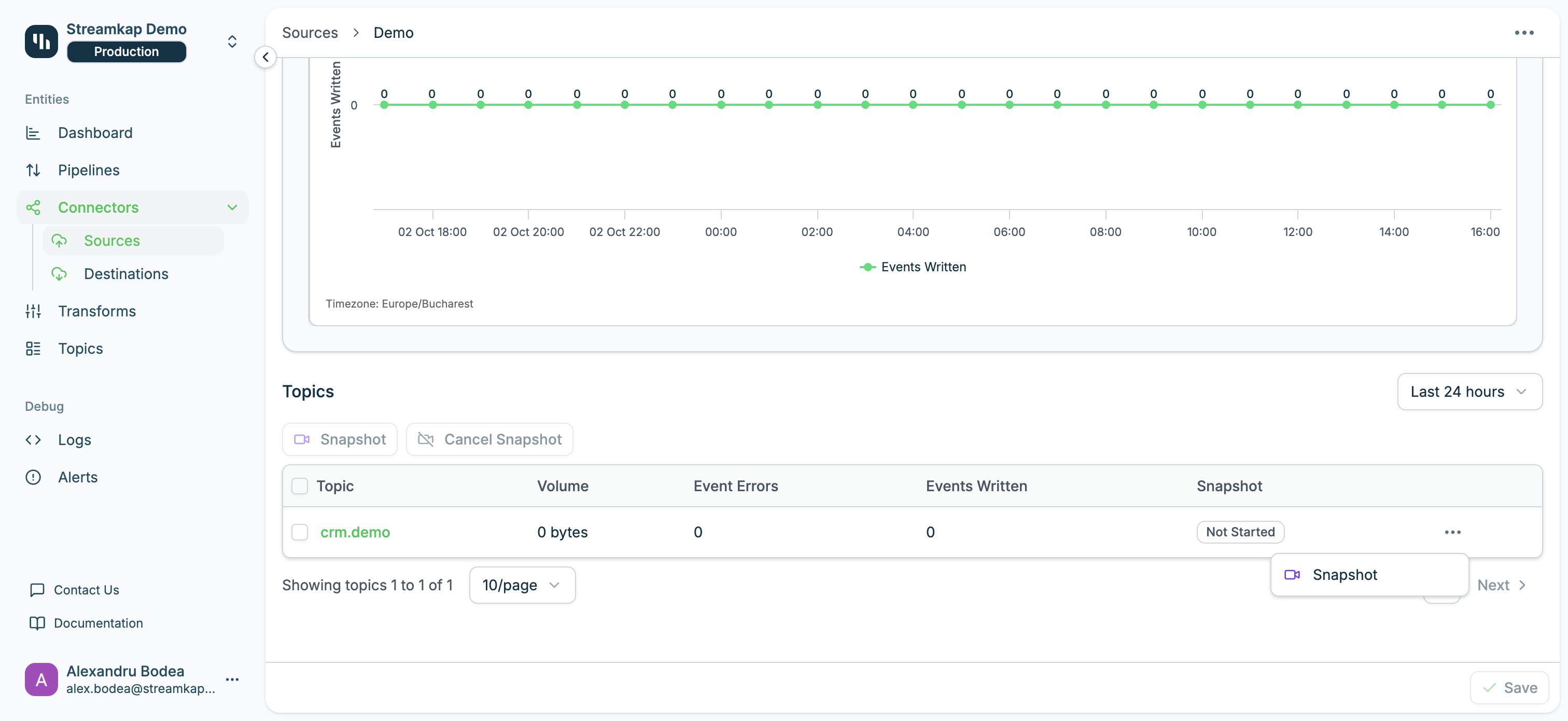 You can trigger an ad-hoc snapshot at the Source level or per Table from the Connector’s page.Source