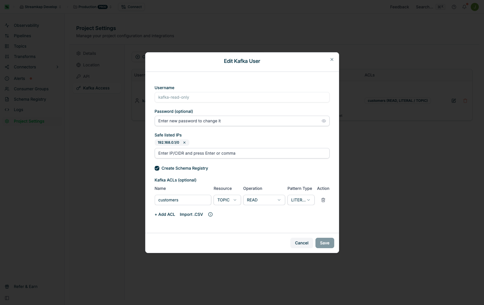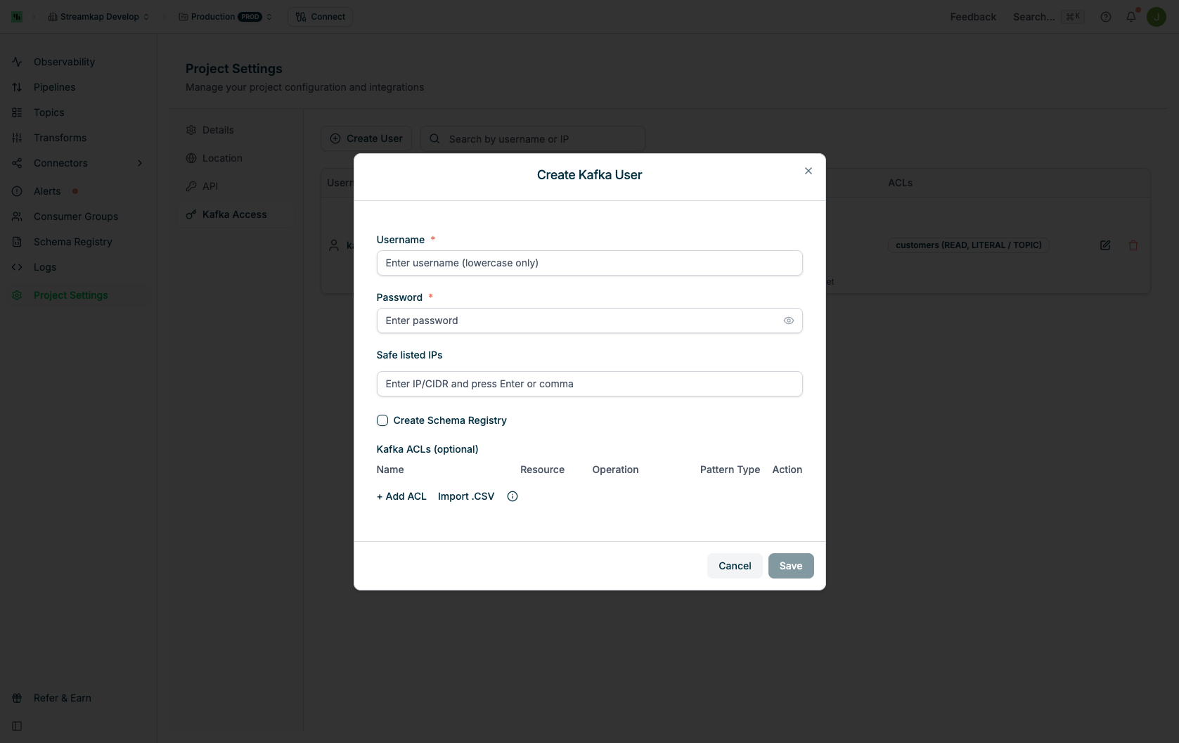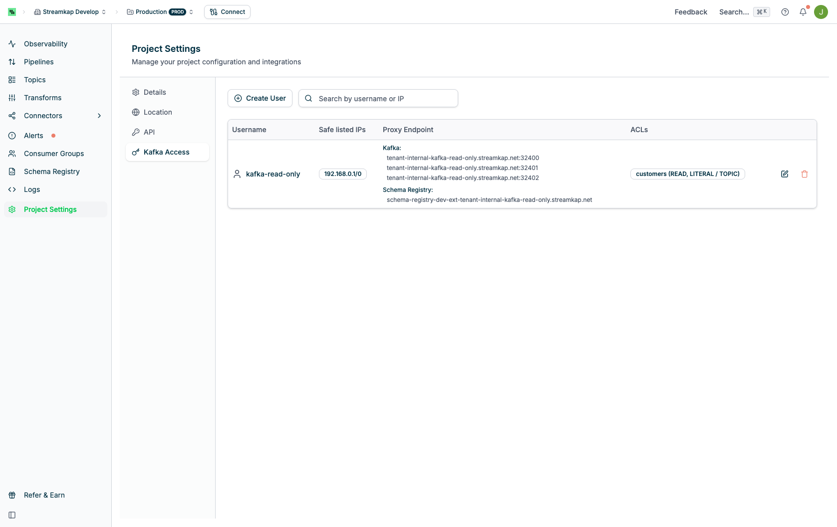 The Kafka Access page is project-specific. You can switch between projects using the project selector in the navigation bar. Each project has its own set of Kafka users and proxy endpoints.ACL Best Practices