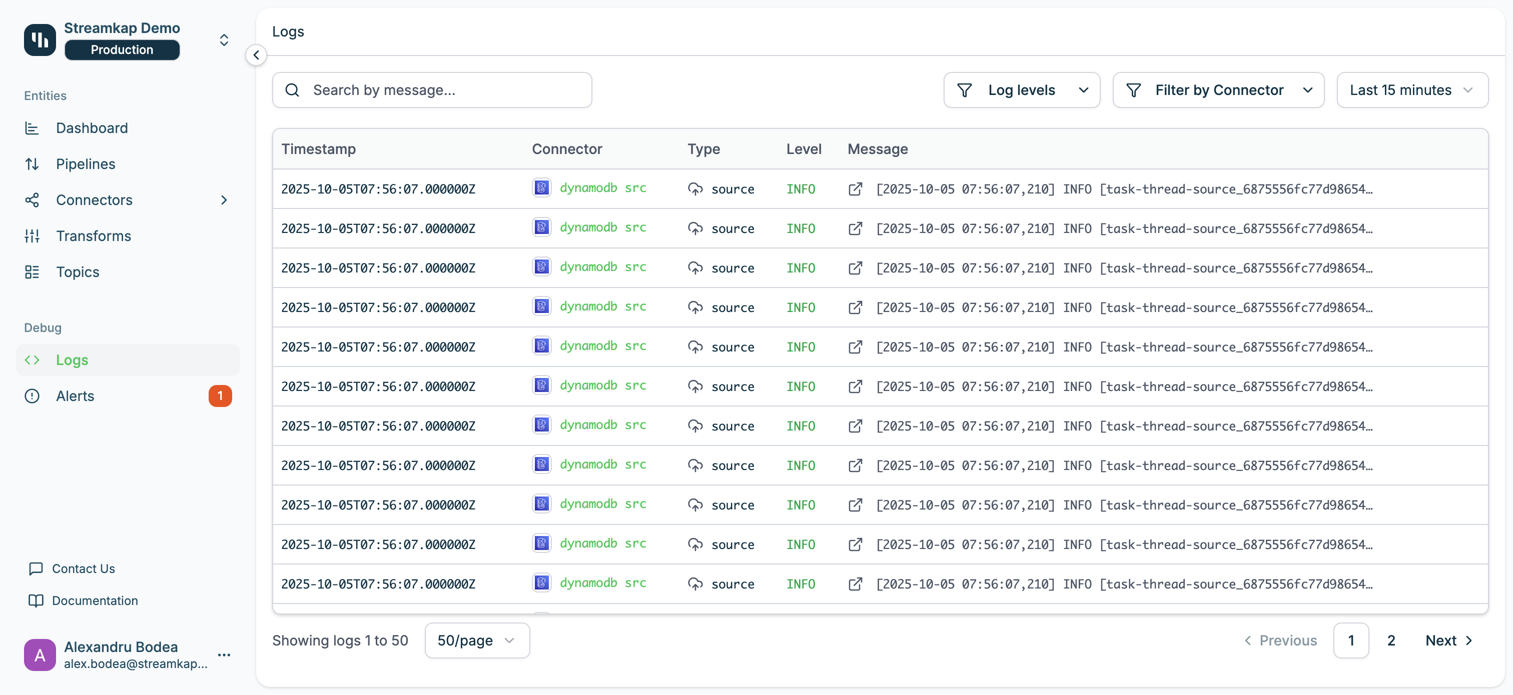 The Logs page displays a real-time stream of log messages from all connectors and system components. Use the search and filtering tools to narrow down logs to specific connectors, log levels, or time ranges.Features