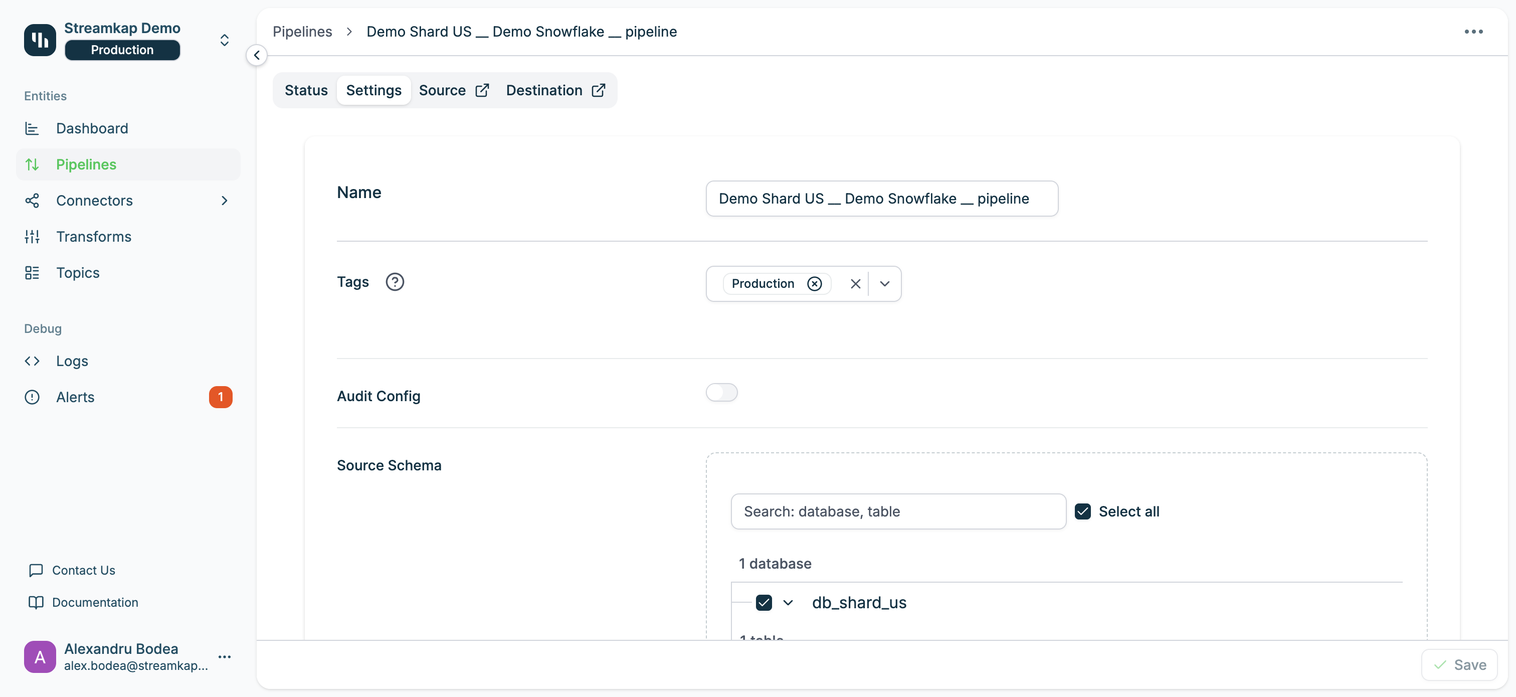 - Destination connector type (Snowflake, BigQuery, Databricks, etc.)