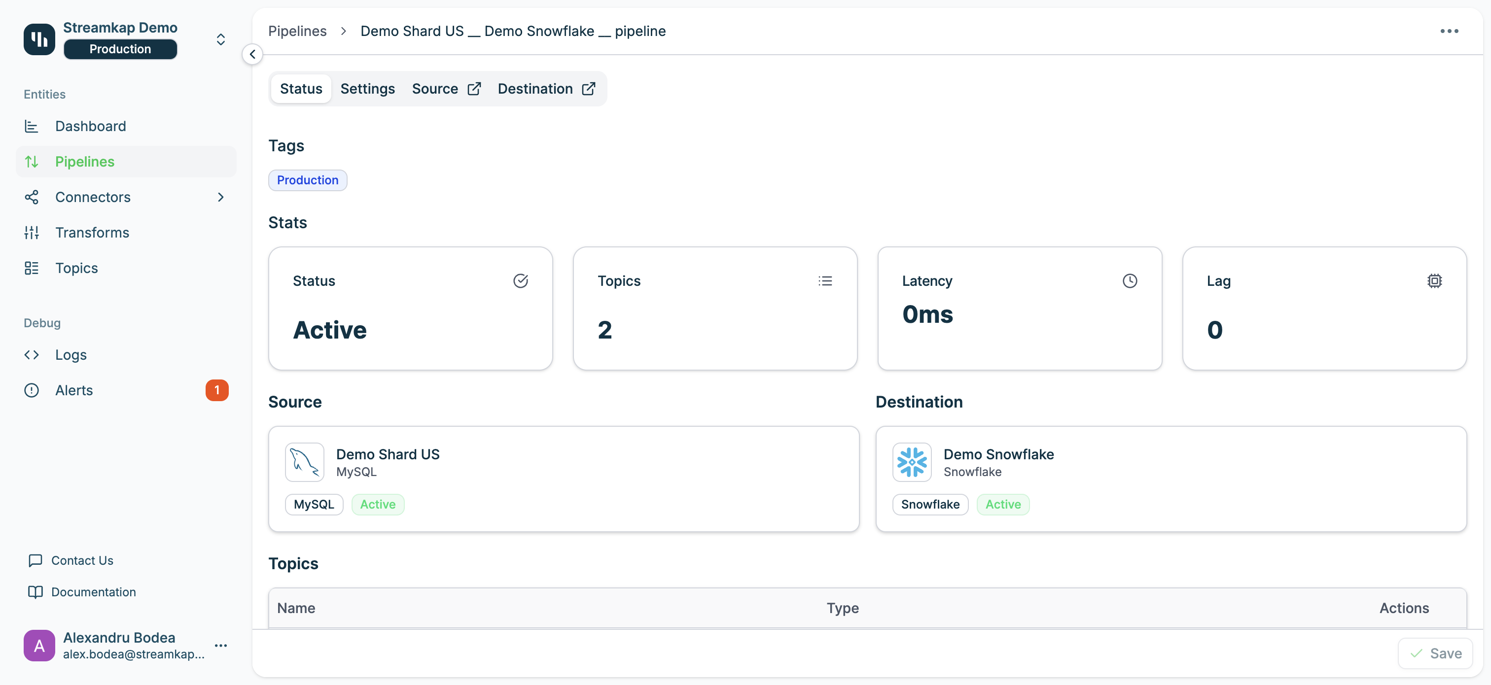 Latency measures how long it takes for data to flow from the source through the pipeline to the destination. Lower latency means near real-time replication.- 0ms - 100ms: Excellent, near real-time