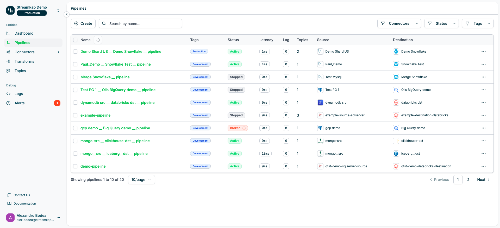 - Status: Current pipeline state (Active, Stopped, or Broken)