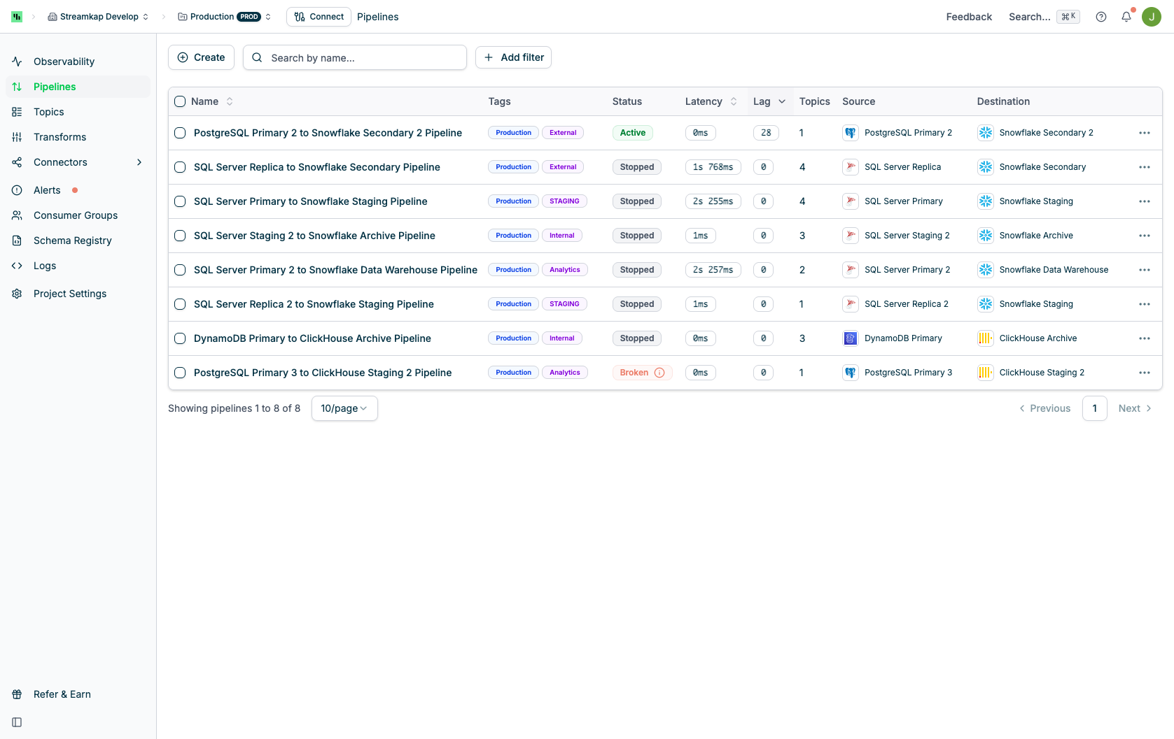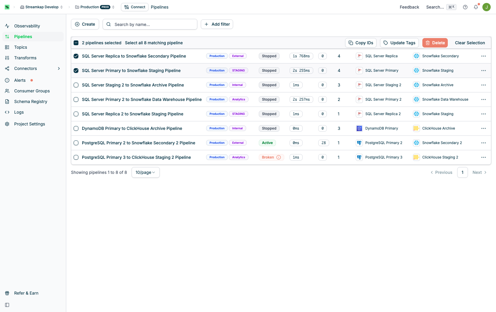 - Filter pipelines by connector, status, or tags