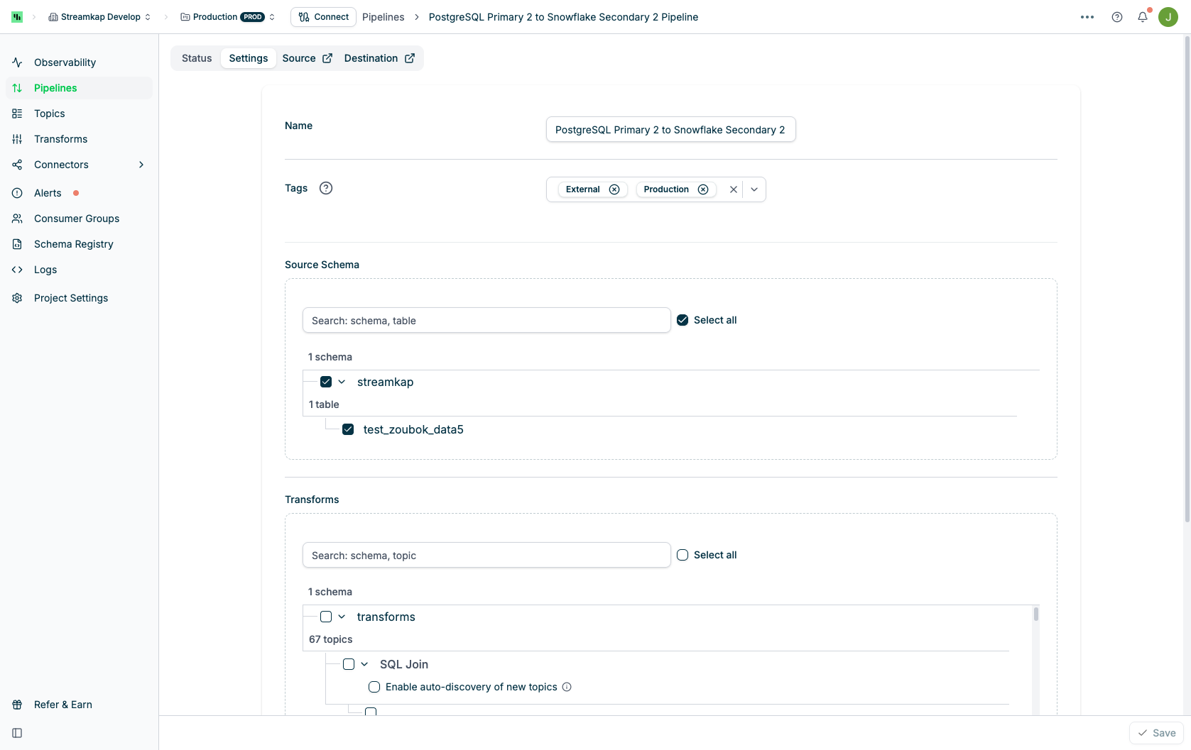 - Configure pipeline settings including schema selection and transforms