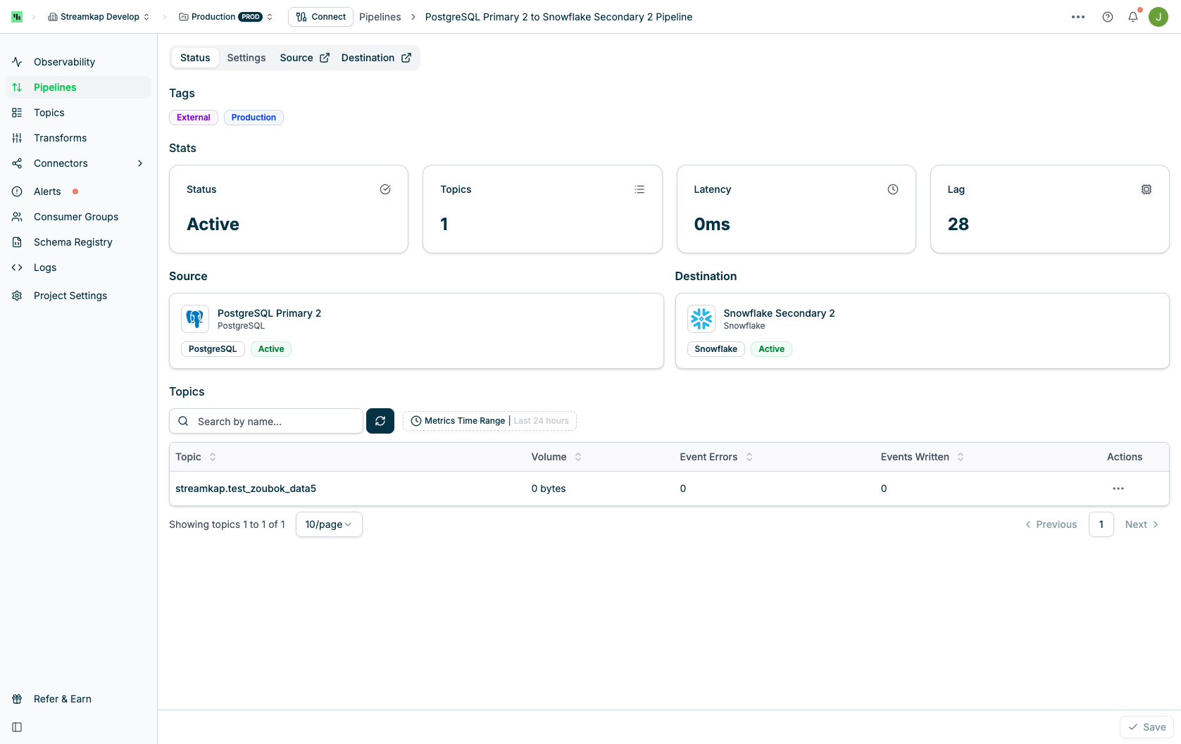 - Source: Source connector type and name (clickable to view details)