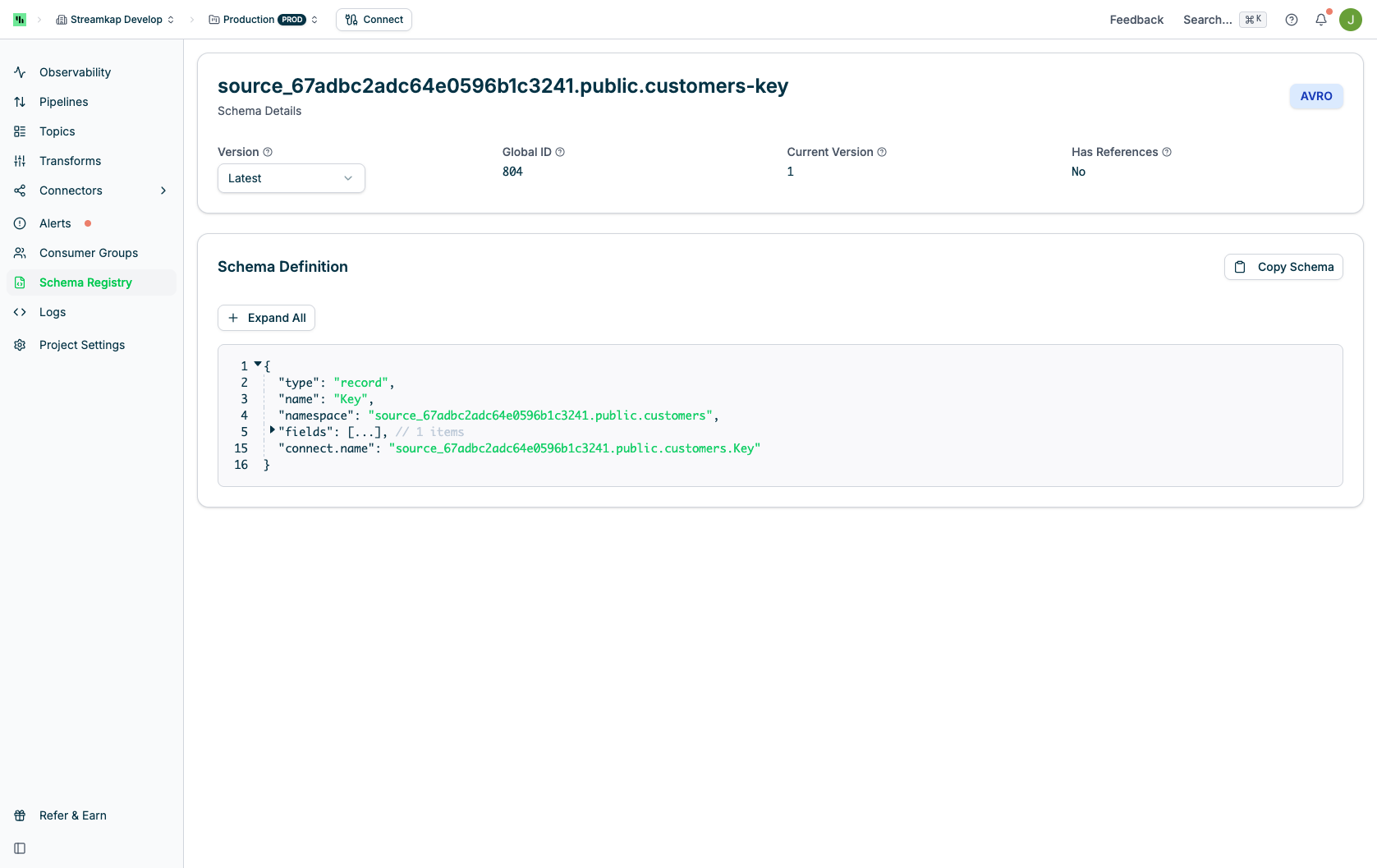 CDC Source Schemas:source_67d010f15ad5681e912ccc5b.ecommerce2.Customers-key: Key schema for Customers tablesource_67d010f15ad5681e912ccc5b.ecommerce2.Customers-value: Value schema for Customers table