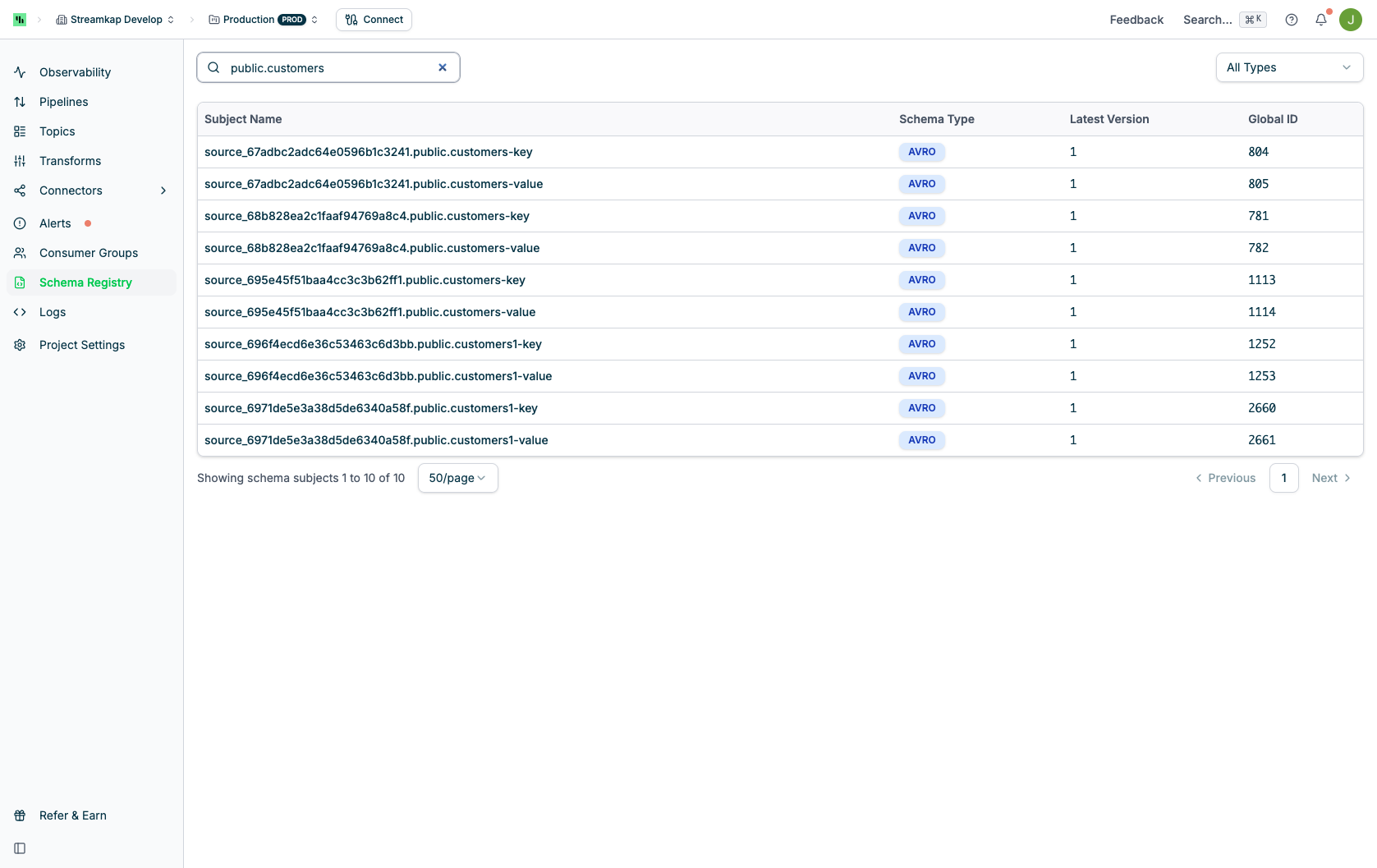 The Schema Registry page displays all schema subjects registered in your project: