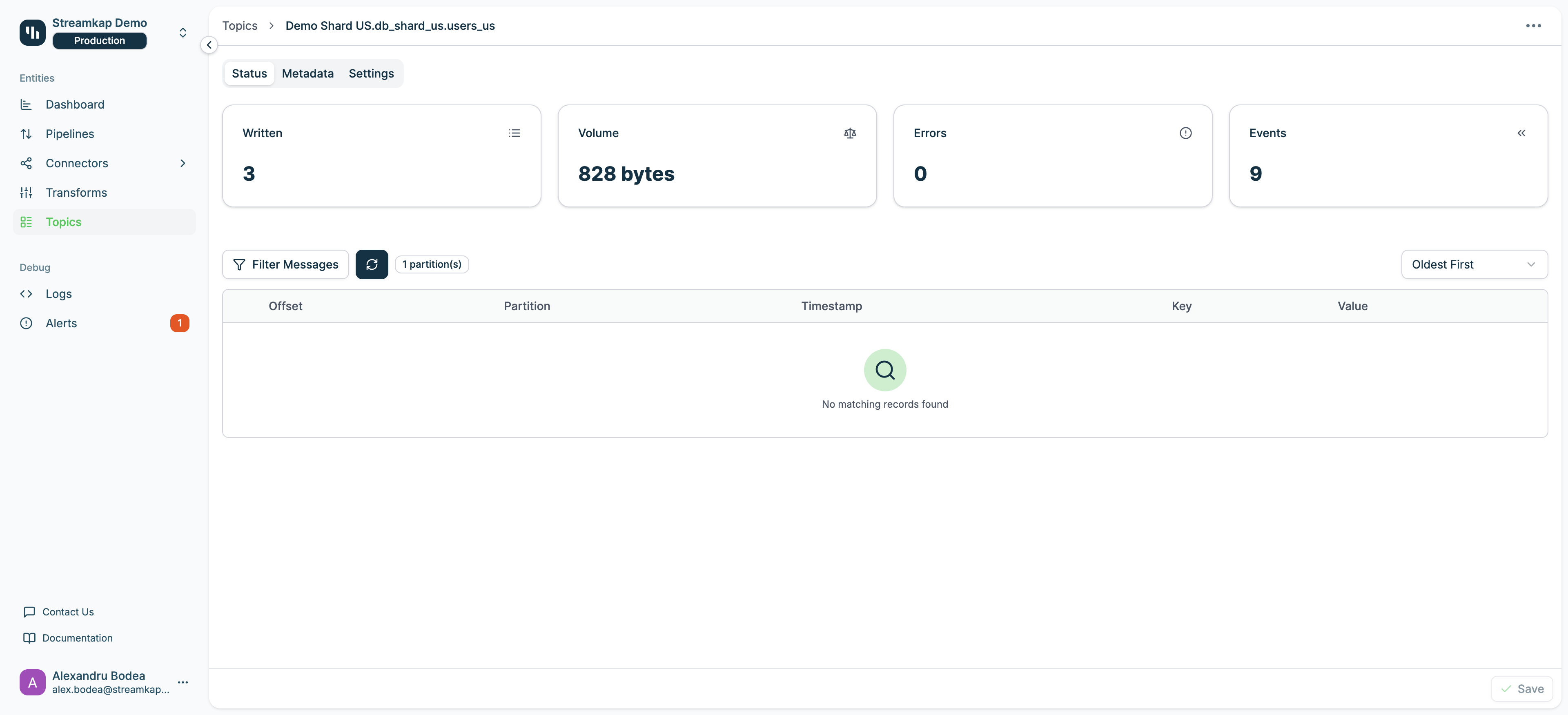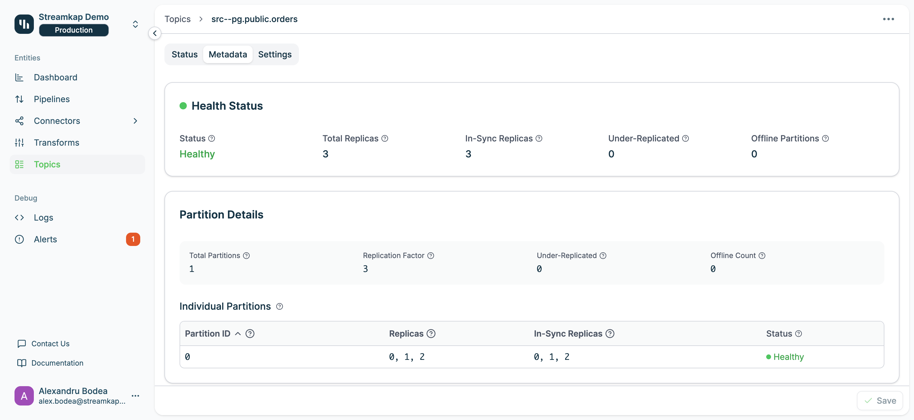 Click any topic name to view detailed information across three tabs: Status, Metadata, and Settings.Status Tab