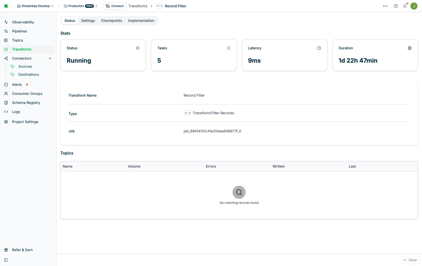 - Latency: Average time for records to be processed by this transform