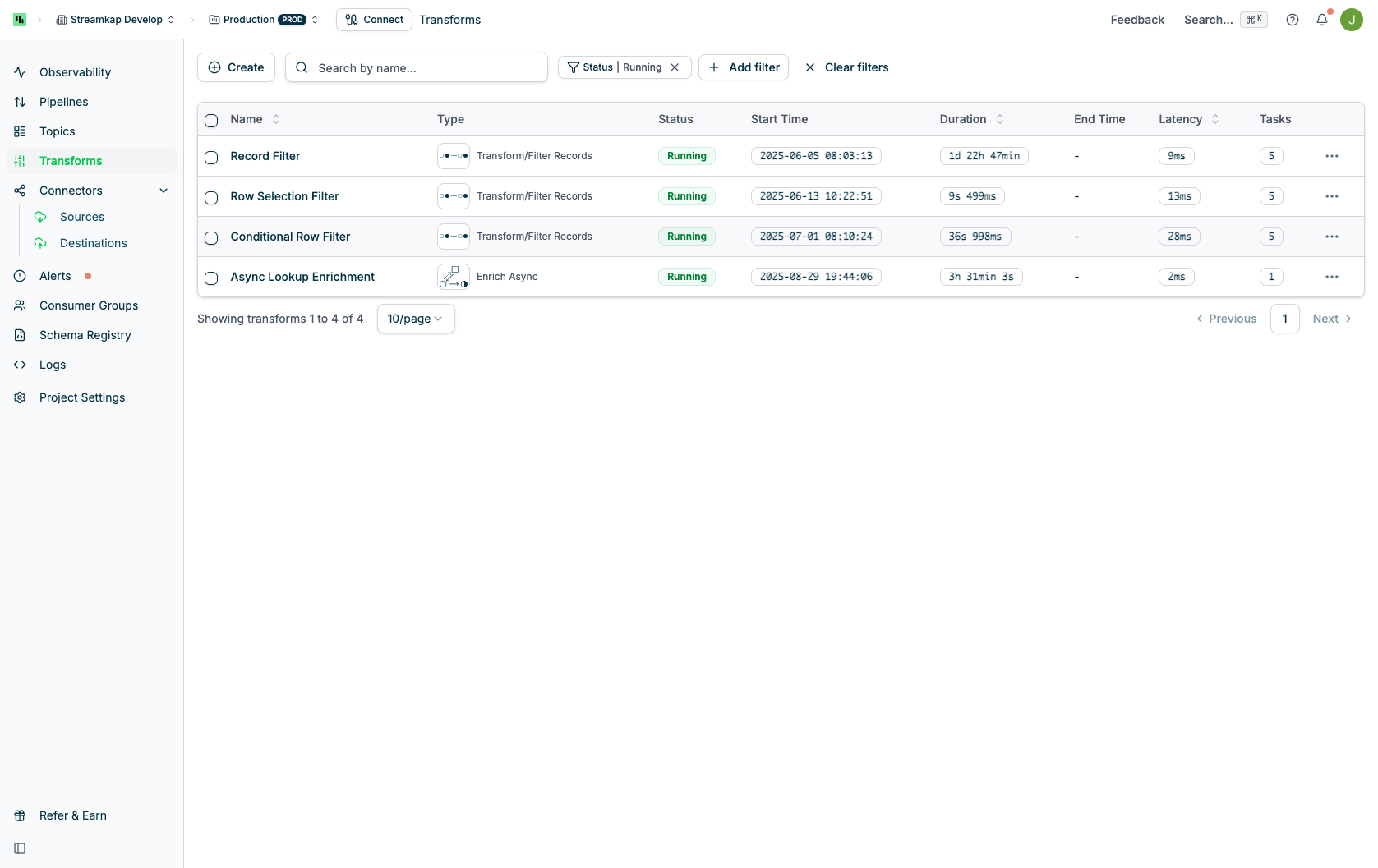 The Transforms page displays all active transforms with their current status and performance metrics: