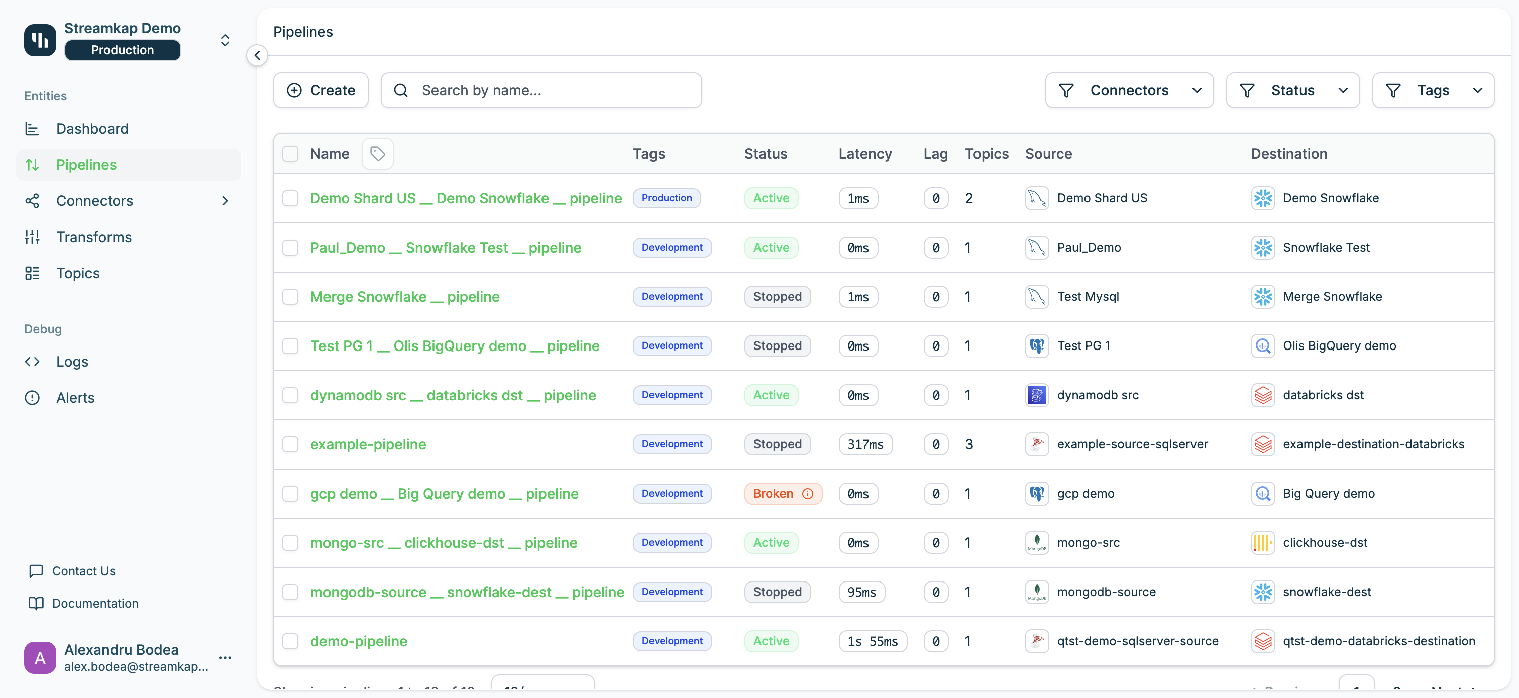 Each pipeline shows status, latency and lag. While lag should be 0, there are situatuons such as the destination service being offline or degraded that it may increase